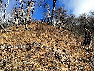 東沢乗越から同角沢の川原(遺言棚の上流)に降り、遺言棚付近から北東に上がる枝尾根に出るまでが道が分りにくい。赤テープなどを頼りに踏跡を探す。標高1160m付近で尾根に出るともう迷う心配はない。丹沢、奥多摩、奥秩父の笹が最近広範囲に枯れているが、ここも尾根に笹がない。前は笹のヤブ漕ぎだったはずだ。酸性雨のせいか、鹿が若芽を食べつくしたせいか議論になったが、鹿が近寄れないような急斜面には笹が残っているので鹿の影響はありそうだ。 |