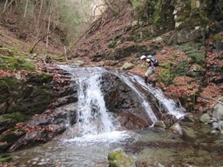 11月29日(日)5:10大和駅に集合し、WN車にて出発する。国道412号線から国道413号線を通り、「道の駅どうし」で休憩。7:00水晶橋に到着し、路肩に駐車する。メンバーはWN 、IZの2名。天候は晴れ。準備をして、7:10出発する。林道を20分程歩き、登山道に入る。8:00城ヶ尾峠に到着。8:10出発し、廃道の地蔵平方面へ向かう。2ヶ所程崩れていたが、それぞれ巻いて、尾根に出る。何ヶ所か分かりにくい所もあったが、読図しながら難なく尾根を下る。9:30沢に出た所で沢靴に履き替え、沢を渡渉して9:50地蔵平に到着する。お地蔵様に手を合わせ、出発する。