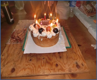 その後小屋の2階で各自くつろぎ宴会が始まる。ちょうど誕生日の男性メンバーの為に女性メンバーからの特性ケーキのサプライズ。