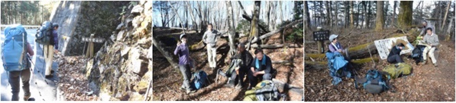 10時に歩き出す。車道を35分ほど歩き、登山口にさしかかる。杉林の中を歩いてく、途中には紅葉が残っていた。天気は快晴だが気温は低い。登山道に入り15分ほど登り休憩をいれ、さらに50分結構急なところを歩くと雁道場(岩道場)の平坦部に着き休憩する。
