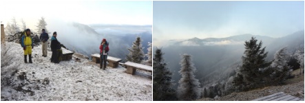 身支度を調え6時40分に歩き出した。日の出は6時30分ですでに明るい中15分歩くと雁坂峠に着いた。風はあるものの天気は良く、周辺の木々は霧氷で美しく、雲海の先に富士山、南アルプスが綺麗であった。雁坂峠は日本三大峠(針ノ木峠、三伏峠)の一つであることを初めて知った。
