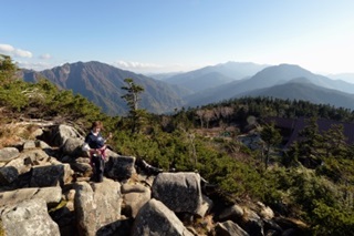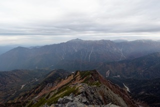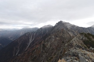 独標から岩稜帯を下り、ピラミッドピークまで細い岩稜のアップダウンを慎重に通り過ぎ、7時08分に着いた。ピラミッドピークから尾根の左側を登り、8時08分に西穂高岳に着いた。もはや頭上の空は雲に覆われてきた。西穂高岳の直下を慎重に下り、ピラミッドピークから独標の間に岩稜を慎重に越えて、9時45分に独標に着いた。