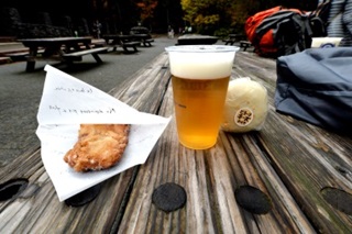 上高地で日帰り入浴ができるところを携帯で検索し上高地アルペンホテルへ行き、風呂で汗を流し、上高地BTで山賊焼きを摘まみに生ビールを飲み、10時40分発の新島々行きのバスに乗車する。バスに乗車すると雨が降り始めたので良い時間に下山したと思った。