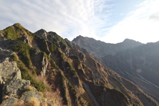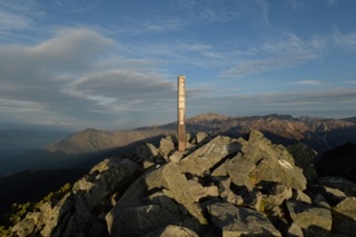 日の出は前穂高岳に隠れ見えないが、八ヶ岳から南アルプスの甲斐駒ヶ岳の周辺が明るくなり、足元も懐電なしで歩くことができた。20分ほどで丸山に着いた。段々と雲が出始めてきて、風も多少あるので寒い。振り返ると樹林に朝日が当たり綺麗であった。また、独標手前で双六岳、黒部五郎岳が見えた。6時過ぎになると笠ヶ岳にも朝日が当たり綺麗であった。6時31分に独標に着いた。雲が広がりつつあるので天候が次第に悪化しつつあることが分かる。
