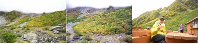 9時40分に涸沢に到着する。直ぐにテントを張った。穂高の稜線は雲に覆われていた。おそらく稜線は雨が降っているだろうと、今日の行動はここまでと言うことで、紅葉の名所の所まで10分ほど登って様子を見る。紅葉の色づきは例年の4割程度かと思う。その後、ヒュッテへ戻り涸沢ヒュッテ名物のおでんを摘まみに生ビールを飲む。