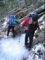 この時期にしては全体的に雪が少なく本沢温泉まではほとんどなかった。年末ともあって登山客も少なくしらびそ小屋で山に雪を抱く硫黄岳とみどり池の絶景を見ながら一休み。その後本沢温泉小屋までの間、登山道上に雪が溶けてつるつるに凍り付いた箇所が何か所かあり、雪が少なくアイゼンを装着していなかったため、足場を注意して探しながら大回りするなどして通過した。昼過ぎにはこの日の宿泊先である本沢温泉に到着した。館内の内湯はこの期間はあいておらず、外湯「石楠花の湯」を利用。男女別1時間ごと交互に定められた入浴時間に従って入浴した。
