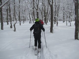 井戸岳山頂で風を避けてランチを摂る。山頂から左へ滑って行き、赤倉岳の東斜面に入って行く。最初の斜面は良かったが、次の斜面はシュカブラがあり滑り難い。その後、沢目を滑り、台地に上がる。台地はややスキーが引っ掛かるので慎重に滑り、沢を渡って行く。雪はあるのだが、何せ気温が高いので気は抜けない。樹林帯に入るとストップ雪(足つかみ)となり、さらに気負抜けない滑りとなる。最後は平坦で14時15分に箒場に着いた。