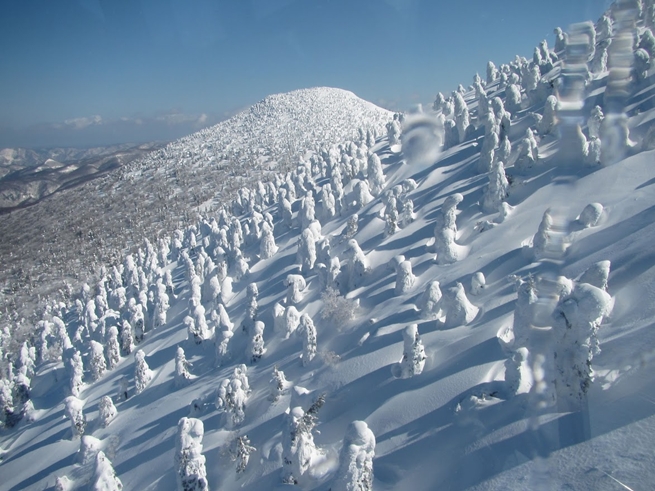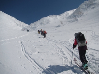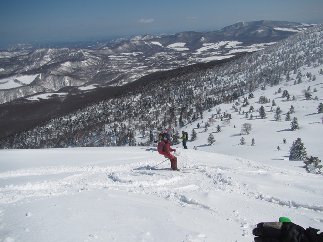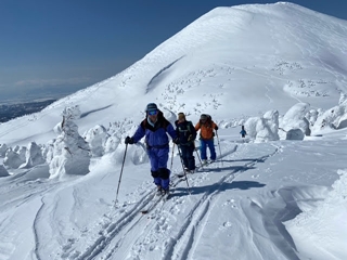 3月の八甲田としては丁度良い時に来たと思った。7日は強風のためRW運休で火箱沢へ行ったが気温が低く適度な積雪でドライパウダーの滑りができた。8日は視界が悪い中山越えルートへ行き、思いのほか雪のある箒場ルートを楽しめた。しかし、IZAには少々手ごわかったようだ。9日は快晴でRW修理の為運休でツアーも酸ヶ湯からハイクアップして、地獄湯の沢を詰めて仙人岱ヒュッテに着いて外でランチとした。小岳に登り高田大岳の鞍部に滑り込み、沢目に入ると素晴らしい雪で楽しかった。トラバースする所ではIZAと一緒に滑り、かなり遅れたか方がいたため、我々ものんびり休憩して箒場から別の車で酸ヶ湯に戻った。10日に銅像へ行ったが雪がとてもよくスキーが走りIZA氏も気分良く滑っていたようで、山スキーに慣れたようだ。
