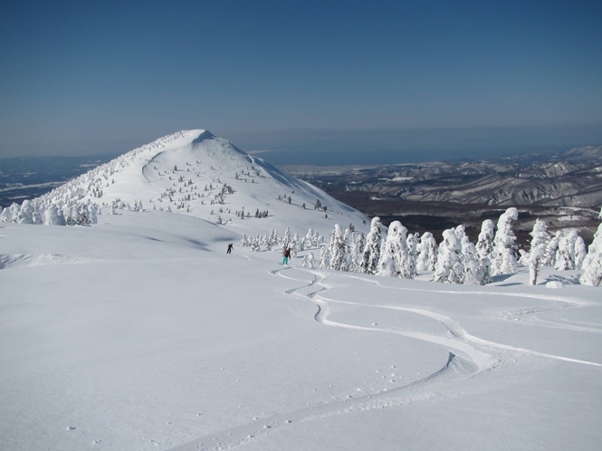 前岳の肩まで登って来た。沢目を越えて行くのだが、いつもより雪が多くえぐれていないので楽に行けた。その後、東斜面に入るとパウダーランが楽しめた。IZA氏も快適に滑っているようだ。沢目に入って行きツリーランを楽しむ。下部はやや重になってきた。沢を渡ってからはボブスレー状態でスピードコントロールして銅像茶屋に11時30分に着いた。