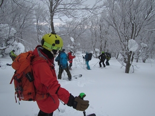 午後のツアーは13時予定であったが、早めにスタートする。田茂萢岳に上がり田茂萢沢は0.5番に滑り込む。最初は急でギャップがあるので注意して左目に滑って行くとノートラックを頂けた。いつものシール付け場に移動する。シールを付けてハイクアップする。右目に登り鳴沢台地へ上がり、チョロ沢の源頭部へ行き、シールを剥がす。チョロ沢に入るとやはり柔らかい雪で楽しい。その後、右下の樹林帯へ行くと何とノートラック三昧でチョー楽しい。IZA氏楽しく滑っている様子。沢の右の樹林帯に入るといささか雪は重くなってきた。沢を越えてテレテレの樹林帯をスピードコントロールして、銅像茶屋に14時35分に着いた。