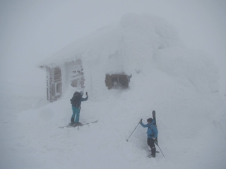 シールを付け10時25分に風雪の中出発する。ガスの中、にせ田茂萢を回り込み宮様コース分岐でシールを剥いで、寒水沢に滑り込む。なかなか良い雪でノートラックが待っていた。いつものシール付け場へ行く。シールを付けハイクアップして、尾根に上がりランチを摂る。寒水沢を詰め、大岳避難小屋まで来ると風があり寒い。そして、井戸岳へ回り込みながら中腹まで登り、シールを剥いで滑走準備に入る。ガスで視界は良くないが、下に降りれば良くなるだろう。沢目の左の木々を目標に滑って行く。柔らかく良い雪だが視界が悪いのが残念だ。その後、沢を滑り左の台地へ上がる頃には視界が利いたし、スキーも走った。沢を越える所も雪が多く埋まっていて滑り易かった。下部樹林帯も柔らかい雪で走ったが、傾斜の無い所ではボーダーは苦労していたようす。15時02分に箒場に到着する。