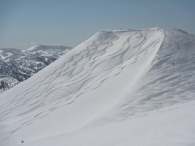 30分ほどして小岳へシール登行する。13時10分に小岳山頂に着いた。大岳と井戸岳・赤倉岳、高田大岳と景色は最高だが、ここは風が強いので寒い。風を避けてシールを剥ぐ。山頂付近はガリガリで、一段降りて高田大岳の鞍部へ滑り込むと何といい雪か!楽しい限り。少しトラバースする所では硬い雪に注意した。そして、沢目に滑って行く所では最高のドライパウダーがありノートラックを探して滑る。