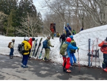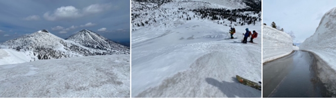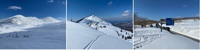 この時期の八甲田はコースに竹竿が付けられているので、行こうと思えば自分たちで行けますが、滑り降りた先の交通機関が無いのでコースを考える必要があります。また、4月1日に八甲田ゴールドラインが開通しましので、笠松峠や睡蓮沼に行け、そこからハイクアップして山スキーを楽しめます。今年は睡蓮沼に数台止めるスペースがあった。また、交通規制があるので確認が必要です。今年の雪の回廊は8mくらいありました。