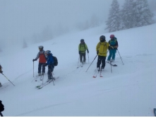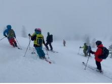 RWは空いていて2便に乗車した。ツアーは9時50分にスタートする。朝の雪は止んだがガスで視界が悪い中、田茂萢岳に登り田茂萢沢に滑り込む。昨日の雪が5cmほど積もり、やや重であるが何とか滑った。シールを付け前岳の肩までハイクアップする。