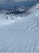 鳴沢台地の東側でシールを取り滑る準備をすると、かなりの強風で山越えに行かなくて良かったと思った。最初の斜面は昨日より気温が高く雪面が緩んでいて滑り易かった。