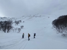 鳴沢台地の東側に登りシールを取りドロップインすると走る雪で楽しい。底でシールを付けハイクアップして、シールを取り赤倉の大斜面に入る。最初はやや重ながら走る雪でしたが、下部はストップ雪で苦労する。その後の樹林帯もストップ雪で先行者のトレースを使うが足が疲れる。下部樹林帯になり気温が上がりシューベット状のトレースを行くが、意外と走り転ぶ。12時45分に八甲田温泉に到着して、迎えのバスでRW山麓駅に着くと、予報通り雨が降り始めツアーは中止となる。