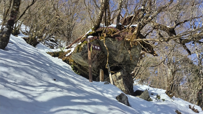 中の段手前から雪が残る道へと変化しました。岩小屋から先、トレースが途切れる箇所もあり、登山口から2時間40分程で十枚峠に着きました。