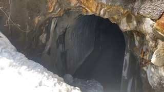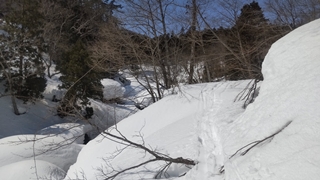 20分ほどで宝川温泉に到着し、林道に入る。林道にはスキーや歩きのトレースがあって助かった。途中のトンネルの中の小さな氷筍がかわいかった。11時過ぎに板幽沢の出合いに到着。ここから林道を離れ、板幽沢の左岸を進む。