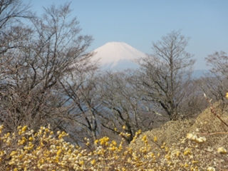 10:05大ノ山山頂の手前で、ミツマタ越に富士山が見える場所で休憩する。10:30出発し、10分程で大ノ山の山頂に到着する。杉林の中で、山頂の標識も何も無い。このまま山頂を通過し、遠見山に向かう。一旦下って、登り返す。11:25遠見山の山頂に到着する。こちらの山頂も杉林の中で、板切れにマジックで書かれた山頂標識がある。