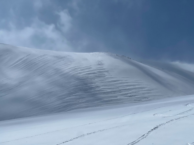 南北にすそ野を広げる白馬乗鞍岳の山体は雪の城壁となって眼前に立ちはだかる。左斜面には強風による風紋が形成されており、右斜面には上部から中部にかけて雪崩の滑走路とデブリが確認出来る。一昨日からの強風の為登山者のトレースはほぼ期待できない為、所々雪の締まり具合でルートを読みながら中央からやや左のラインをラッセルで高度を上げて行く。稜線に向かうごとに風は更に強くなり、耐風姿勢で一歩ずつ進んでいく。