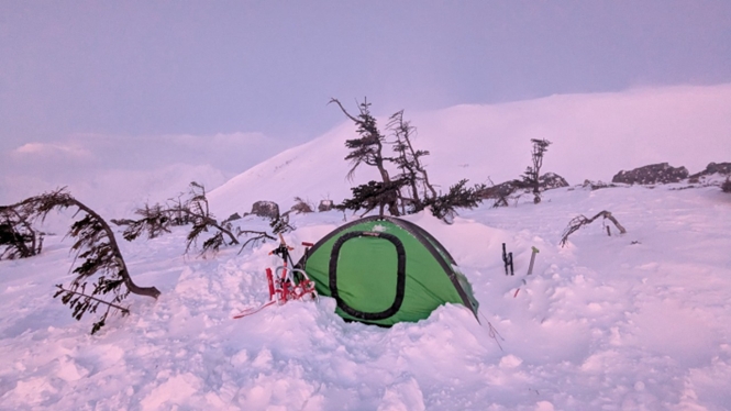 深夜に気が付くと雪がテントの高さの1/3くらいまで積もり、雪の重みでテントの内側がたわんでいる。テントがつぶれない様に、定期的に内側から雪を押し戻した。雪かきはトイレに1回出た時と、翌朝出発する時の2回だけで何とかしのげた。結果的にテントの周りに防風壁が構築されて、テントごと吹き飛ばされるのを防いでくれた。翌日も強風予報である事には変わりはないが、風が落ち着く時間帯もあるだろうと思っていたが、明け方まで引っ切り無しに爆風は続いた。