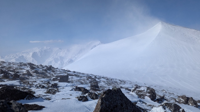 前々日まで大雪だった為、ワカンを付けても雪に埋もれ、汗をかきながら高度を上げて行く。前方から強風と共に雪が舞い上がり、山体が確認しにくい為に、GPSで何度も方向を確認しながら進む。スキーヤーは天狗原まで行かず、2000m付近で左右の斜面から思い思いに滑走していく。見渡す限り私ともう一人の単独者だけになり、何も言わずともお互い協力しあい、先頭を交代して歩みを進めた。