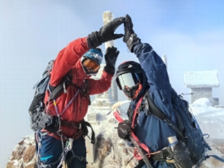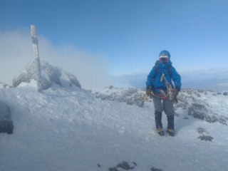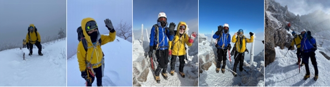 6時半を過ぎると周囲は明るくなりヘッデンは必要なかった。20分ほどして樹林帯を抜け鉄の階段が出てくる。鎖や手すりがあるので慎重に高度を上げるが、雪もほどよく付いていてアイゼンが良く利いた。主稜の取り付きのテラスで休憩を入れるが寒い。Iさんが手の寒さのため、下山すると降りて行った。3名はその後も高度を上げて、2600m付近を越えてトラバースに入り、稜線に上がるとそこそこの風があった。Kの後ろを歩くTさんに風が強いがどうしますかと訪ねると、体力的には大丈夫との事で先を行く。