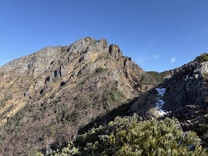 1Pよりも明らかに弱点の多い短い壁が見える。ランナーはリングボルト2本、浅いピナクルで3か所取り、細い灌木が4~5本あったのでビレー支点とした。その後コンテで大岩を右側から回り込み、南稜ルンゼルートと合流する手前でロープをしまった。