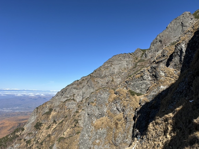 ONOZさんが下部のピナクルで支点を構築し、そこを0ピン目に登る。冬季を想定して登山靴で登る。出だしで浅いピナクルに15スリングをかけてランナーを取る。途中狭い岩の下のハーケンを見落としてしまう。狭い岩の隙間を抜ける時にリュックが引っ掛かるが、ずりずりと背中を押し付けながら乗越す事が出来た。風も少しあったのでコールの意思疎通が困難にならない様にここでピッチを区切る事にした。上部に突き出た岩があったので120スリングを2本かけてビレー支点を構築する。