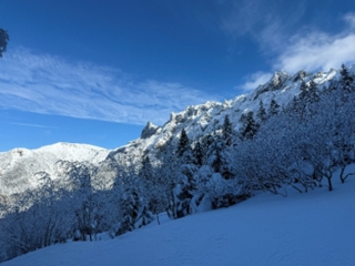冬季バリエーションにチャレンジする為に会の先輩に多くのご指導を頂いた。特に鷹取山でのアイゼンを付けて、手には割り箸を持って登り降りする練習が岩稜帯でのバランス保持に大きく影響した。今後も訓練を積み重ねて安全登山を遂行していきたい。
