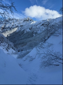 北稜を登ったグループが阿弥陀岳の下降でミスをするケースは少なくない事を知っていた。頂上直下の東斜面には想像以上に乾雪が吹き溜まっており滑り台の様相で、堆積した乾雪にはアイゼンもアックスも効きづらく、バックステップとダブルアックスで慎重に降りた。途中一部鎖が雪の上に出ていた。鉄ハシゴは下部は雪に埋まっていた。中岳のコルまで降りると一安心だが、中岳沢への下降も乾雪の吹き溜まりになっており、雪崩のリスクを考慮して慎重にかつ素早く沢を抜ける事を意識した。中岳沢は無雪期よりも段差が埋まって下りやすく10時に行者小屋に着いた。