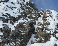 第一岩峰手前の急登は雪壁の様になっており、ダブルアックスで乗越すと第一岩峰が出迎える。単独の為、ノーロープで正面左のルートを中間のペツルのアンカーボルトがある所まで登るも、アックスが効く箇所が乏しく、やはりランナーを取れないと思い切って登る事が出来ないと判断し、クライムダウンした。岩の左に回り込みクラックから登り返す。こちらもアックスが効く箇所はほぼ無いが、グリップで容易に登れた。短いリッジを渡り第二岩峰に着く。無雪期は岩の左に回り込んで草付きから巻くルートも確認できたが、岩の左側面は雪が吹き溜まっておりとても通れそうにはなかった。