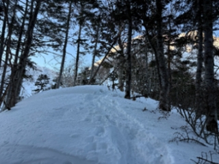 2/11にまとまった降雪があり、本日は今期一番の日照りとなる為、雪崩のリスクが高まっている。ふとリュックが重たく、登攀装備と冬季テン泊装備を歩荷するのは、初めての経験だと歩きながら気づく。年末の阿弥陀岳北稜は、冬季単独の初めてのバリエーションだった事もあり行者小屋を使用した経緯があった。行者小屋に着くのに4時間程かかってしまい、ツェルト泊を試すチャンスだったと後悔する。