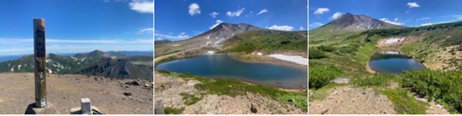 暑いこともあり自販機で飲み物を購入して姿見駅(山頂駅)を7時にスタートする。姿見池では風があり湖面に映る旭岳の写真を撮ることは出来なかった。6合目で休憩して山頂に8時45分に着いた。多くの登山者は裾合平か層雲峡に縦走するらしく、登ってきた方向と逆方向尾に下って行った。山頂を9時に下山開始して、噴気孔や夫婦池の方を回ると外国人の方が多かった。姿見駅に11時に着いた。