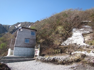 この日は移動して、安来市の道の駅あらエッサに車中泊する。朝起きると、空は快晴。移動して、大山の夏山登山口に6:10到着する。準備をして、6:30出発。登山道は、延々と階段が続く。途中1回休憩を取り、8:20六合目避難小屋に到着する。小屋の脇から上部に残雪が少しあったが、特に問題はない。直ぐに無くなり、その後は、山頂まで登山道に雪は無い。