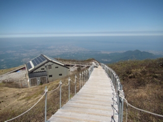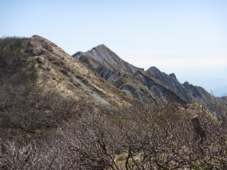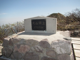 樹林帯を抜けると、素晴らしい景色が広がる。途中1回休憩を取り、9:55大山の山頂、弥山に到着する。大山の最高峰は剣ヶ峰だが、登山禁止。弥山の山頂もピークは立入禁止。ピークの手前にロープが張って有り、反対側を見ることが出来ないが、剣ヶ峰のある稜線だけ見ることが出来る。