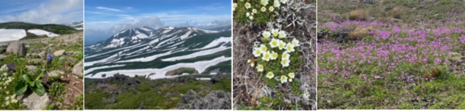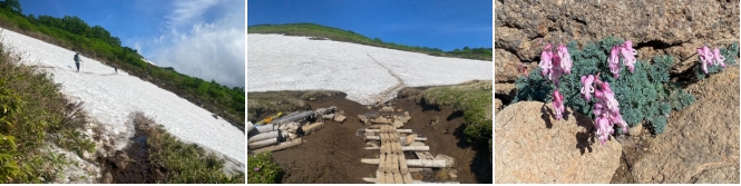 赤岳から小泉岳に来るとホソバウルップソウが満開であった。白雲岳に登るとここもチングルマが満開で綺麗であった。旭岳とゼブラ(雪とハイマツの縞模様)を眺め、北海岳に向かう。ここは残雪が多いが、雪解けしたところから高山植物が咲いている。