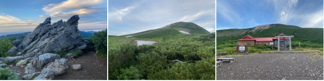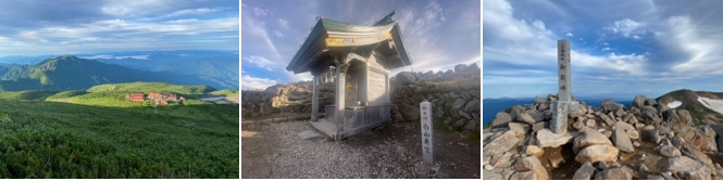 2時30分に起床すると西の空に月が輝やいていた。3時50分にヘッドランプを点灯して出発する。トンビ尾根コースで登る。4時半頃には周囲が明るくなり始め、直ぐに東の空の雲が赤く染まった。展望コースで行けば北アルプスと朝焼けが望めたのではないかと少し残念に思った。尾根を登り切ると、そこにトンビ岩があった。ハイマツ帯の傾斜がゆるやかな登山道を行くと、白山の山頂が見えて、5時50分に室堂に着いた。