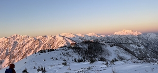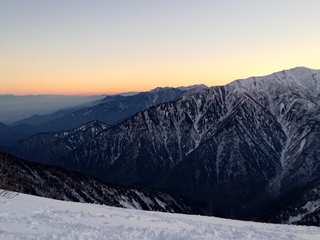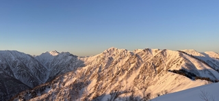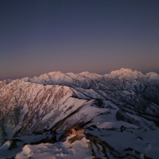 4時に起床し5時15分にヘッ電を付けて出発した。暗闇の中で徐々に東の地平線がオレンジに色づく変化にわくわくしながら進んだ。6時に爺ヶ岳南峰に着くと西風が強く、中峰に向かう事も、南峰で日の出を待ち続ける事も難しいと思われた為、集合写真を撮って下山する事にした。下山途中に正面に聳える剱岳を中心とした山々が、日の出と共に様々な配色のグラデーションに包まれていく様子に、何度も立ち止まっては写真を撮った。