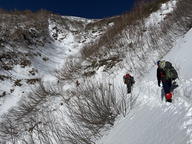 8時頃に柏原新道登山口に登山届を出してから出発する。1900m手前の2回目の休憩時にアイゼンを装着し、富士見坂手前の雪崩地形のトラバースは新雪の為雪崩可能性が高かったので、間隔を開けて慎重にかつ素早く通過した。新雪の為足場が固まらず狭いトラバースとなり、対向者が通れずやや渋滞が発生していた。