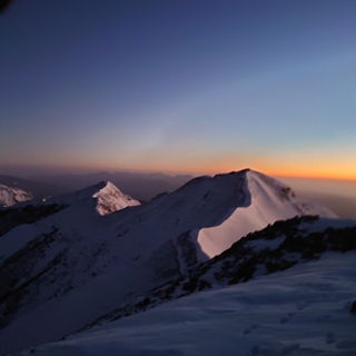 雪を溶かして一人あたり約1.5?分の水を作った後は、各自遅めの昼食を食べたり夕暮れに染まる山々を時々眺めたりしてのんびり過ごした。TUKIさんの提案で、日の出を山頂で見れる様に出発時間を調整してから、19時前には就寝した。