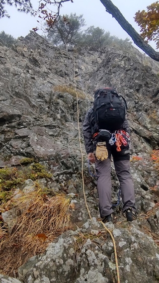 ヤマレコの他者の記録では残置ハーケンがあるとの事だったが見つけられず、浅いピナクルにランナーを取る。その後立木に数か所ランナーが取れた。40mほどで1Pの岩稜は終了するが、45m程伸ばした所の立木で支点を構築した。