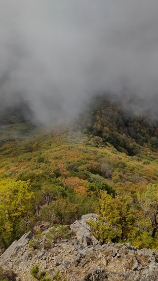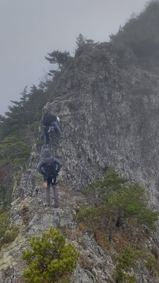 ここから先は、ロープをリュックにしまい、登山靴に履き替えて、山頂まで馬の背の様な箇所を3点支持で慎重に進んだ。11時32分山頂に着き、雨に降られない様に早々に下山した。