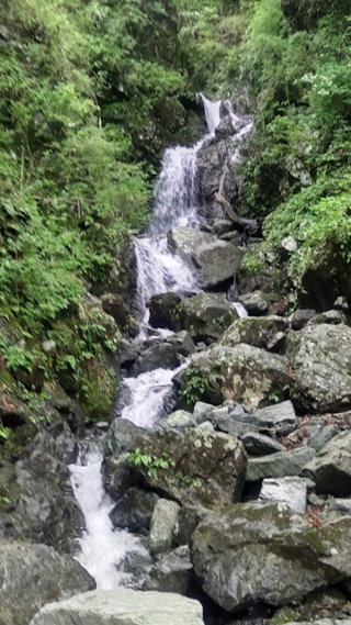 7時に再出発。天神尾根の登り口まで登山道を辿り、水無川に入る。水無川のF1は左の鎖のついたルートをたどり滝の上からセドの沢に入る。