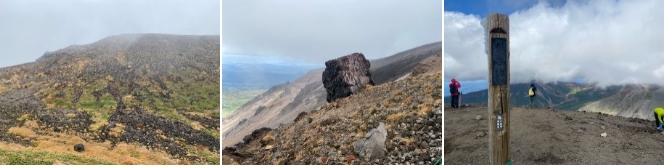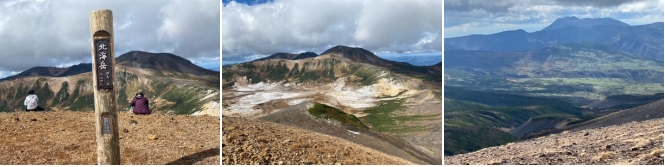 9合目を過ぎてからガスが上がり始めた。金庫岩を過ぎてひと頑張りすると13時15分に旭岳山頂に着いた。着いた時には山頂はガスに包まれていたが、直ぐにガスが取れ、黒岳から白雲岳の景色が楽しめた。また、遠くには雌阿寒岳、阿寒富士の山が確認できて本日山頂に上がって良かったと思った。山頂では手元の温度計で5℃で、風もあるのでとても寒く感じた。