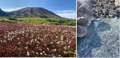 姿見駅を6時25分に裾合平に向けスタートをする。こちらは登山者が極めて少ない。旭岳や山麓の景色を楽しみながら歩く。途中休憩を入れ裾合平分岐に到着する。その後、中岳温泉目指して歩くと、チングルマの紅葉と旭岳のロケーションを楽しみながら登る。
