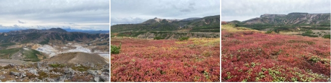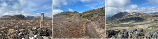 飛び石連休の土曜日ともあり、多くの登山者が旭岳に登っていた。裾合平へ行く登山者は少なかった。高曇りで展望は得られ、旭岳を眺めながら裾野を歩いて行く。裾合平ではチングルマの紅葉と旭岳のロケーションを楽しめたのは良かった。