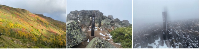 低気圧が抜け天気は回復するかと思って白雲岳から黒岳へ向かう予定であったが、赤岳を過ぎて風が強く雪も降っていて、冬山の様相なので小泉岳から下山することにした。赤岳を過ぎると風も止み、晴れ間も出て来た。紅葉を楽しみながら銀泉台に下った。