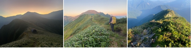 小屋を4時55分に出発する。5時20分頃に東の空が明るくなり太陽は見えないが日の出と思われる。谷川岳は元より、至仏山から燧ケ岳の山も確認できた。中々良いロケーションである。大障子の頭を越えて下る所はやせ尾根で慎重に下る。鞍部で休憩して、万太郎山に登り返す。吾作新道の様子が良く分かる。その分岐にでてから数分で万太郎山山頂になる。エビス大黒の頭から仙ノ倉山の稜線が見える。まだ遠いなあと感じる。