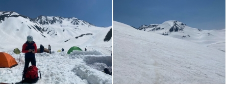 5時半に起床して準備を整えて扇沢発の6時30分始発のバスに乗れた。ダムを歩き7時10分発のケーブル(2本待ち)に乗車して、一本待ちの7時35分発のロープウエイに乗車できた。室堂ターミナルに8時30分に着いて、スキーケースなど不要は荷物をロッカーに入れ、スキー靴にアイゼンを装着し、スキーをザックに付け雷鳥平に向け歩いて行った。1時間ほどで雷鳥平に着きテントを設営した。予想より早く着けたので休憩してシールを着け、山崎カールへ向けシール登行をする。2名はスキーアイゼンを装着した。